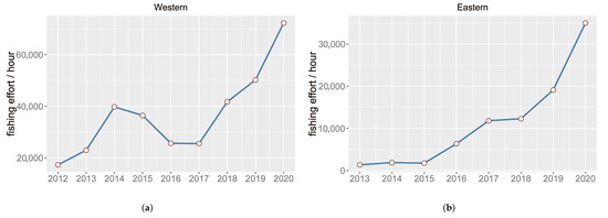 (a) Annual fishing effort to the west of . (b) Annual fishing effort to the east of .