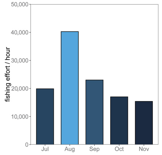 There was obvious seasonal variability in the impact of the month factor on fishing effort in this study (Figure 3). The fishing effort from October to November was lower than from July to September. The results were similar to those in the study of Yu et al. [6]. The maximum and minimum value of fishing effort occurred in August and November, respectively, in this study. The squid population migrated to the Oyashio Current Frontal Zone and the surrounding waters between and from August to October during the main fishing seasons [6]. Fan et al. [42] suggested that O. bartramii migrate northward to feed in July and August. Tian et al. [43] and Wei et al. [44] suggested that sexually mature male O. bartramii individuals start migrating south to spawn in October to November, while female O. bartramii individuals are sexually mature later and generally migrate south to spawn in November to December. Therefore, the squid breeding was mainly in the traditional fishing grounds of China. Accordingly, the fishing effort was increased due to large number of vessels in August. Nevertheless, the squid migrated south to spawn in November, and the fishing effort was low. Furthermore, the above discussion revealed the reason for the spatial variation in fishing effort from July to November in Figure 4.