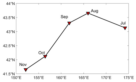 Distribution of gravity center of average monthly fishing effort of squid-jigging vessels in the North Pacific Ocean from July to November during 2017 to 2020.
