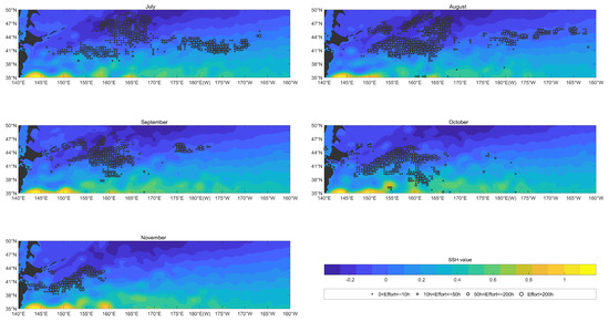 As shown in Figure 5, the variation in SSH was not obvious from July to November in 2017–2020. The areas with SSH values were concentrated along the coast of the Japanese Archipelago to the east into the sea in the vicinity of , , with SSH values above 1 m in this area, and there was almost no fishing effort distributed within this area.