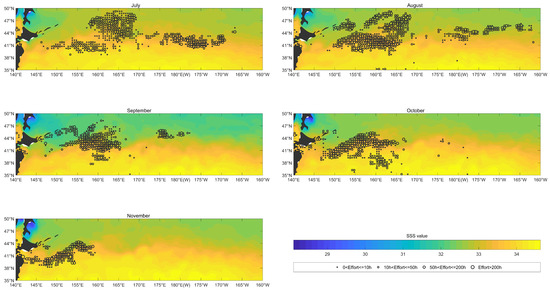 The overlay map of SSS (color shading; units: dimensionless) and monthly fishing efforts (circle; units: h) of O. bartramii in the North Pacific Ocean from July to November from 2017 to 2020.