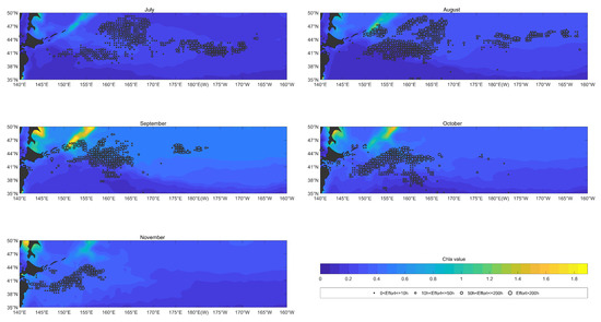 The overlay map of Chla (color shading; units: ) and monthly fishing efforts (circle; units: h) of O. bartramii in the North Pacific Ocean from July to November between 2017 and 2020.