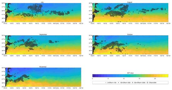The overlay map of SST (color shading; units: ) and monthly fishing efforts (circle; units: h) of O. bartramii in the North Pacific Ocean from July to November during 2017 to 2020.