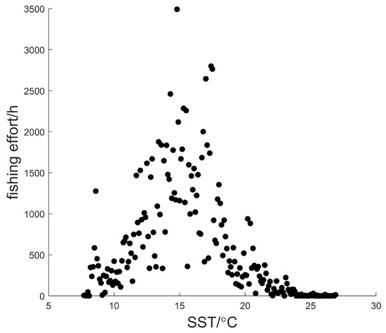 Almost no fishing effort was distributed in waters with SST over from July to November. In July, the fishing effort was concentrated in waters with sea surface temperatures between and . In August, the area of high SST waters in the North Pacific expanded from south to north, and the fishing effort area moved northward with the low SST waters, and the SST of the fishing effort area was between and . The area of waters with a high SST in the North Pacific decreased from north to south from September to November, and the area of low-temperature waters began to increase southward, with the fishing effort area moving southward with low-temperature waters. During this period, the SST of the fishing effort area was between and in September and October, and the SST of the fishing effort area was between and in November.