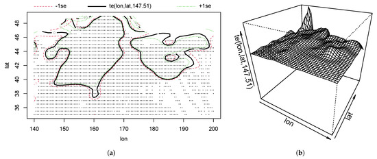 The solid black line in Figure 13a indicated the area where the fishing effort of squid-jigging vessels in the North Pacific Ocean was mainly distributed. The red dashed line (a positive standard deviation) and the green dashed line (a negative standard deviation) indicate confidence intervals for the area of operation of squid-jigging vessels. The area showed a closed curve of one layer, distributed in the regions of , and , . A three-dimensional spatial plot of the impact of latitude and longitude on the fishing effort (Figure 13b) showed that two mountain range bumps appeared in the fishing area, corresponding to the areas of , and , in Figure 13a. The favorable area for fishing effort was in , by combining Figure 4 and Figure 13a.