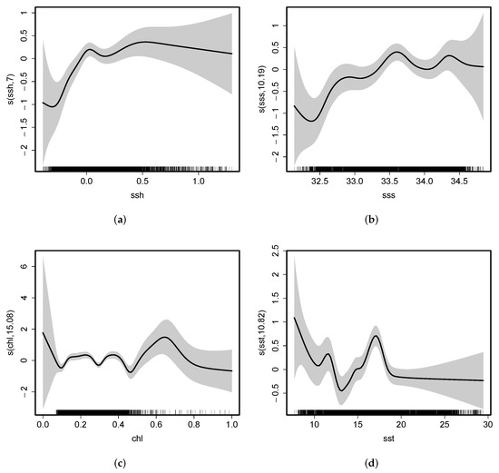The final GAM model without latitude and longitude showed that the deviance explained by the model was 16.3% at the significance level of (Table 6). The SST had the greatest influence on fishing effort, followed by SSS. The contribution of Chla was lowest in the GAM model. In addition, intervals of the suitable marine environmental variables for fishing effort obtained from this GAM model were generally consistent with Figure 14a–d (see Figure S7 in the Supplementary Materials).