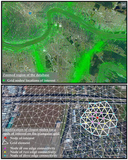 16] have been proven as appropriate for performing this imputation, leveraging the spatial correlation between nodes in order to infer missing data based on the surge values of other inundated nodes in close proximity. The selection of the exact type of geospatial interpolation depends on the number of nodes for which surge data is available, whether they correspond to the original numerical grid, which may include hundreds of thousands of nodes, or to some selected, few (up to a couple of thousand) save points. In the former case, a weighted