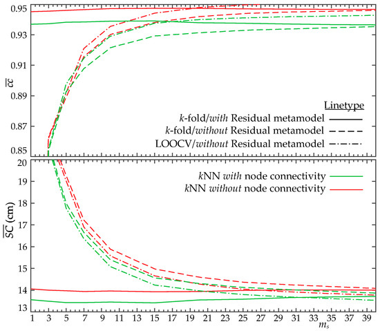 The developments of two separate metamodels to obtain the predictions is examined in this section, distinguishing the nodes based on the quality of information available for them: the class of problematic nodes, , and the remaining nodes, composed of classes and , referenced herein as “trustworthy nodes”. For the problematic nodes, , the previous established predictions are utilized, while a separate metamodel is developed for the trustworthy nodes. For this portion of the database (trustworthy nodes), the pseudo-surge values are expected to have a higher degree of smoothness independent of the approach taken at the kNN imputation stage (regarding the use or not of the connectivity information), which should establish higher accuracy surge predictions. This is the motivation for considering a separate surrogate model for them, developed without including the problematic nodes. It should be stressed that the latter nodes are expected to belong to domains with complex geomorphologies with little correlation to the remaining nodes, as clearly indicated by the large values of the maximum surge misinformation. Therefore, combining their information in the development of a single metamodel, , for the surge predictions across all nodes has the potential to lower the overall accuracy, since this metamodel is forced to fit portions of the database with highly dissimilar behavior.