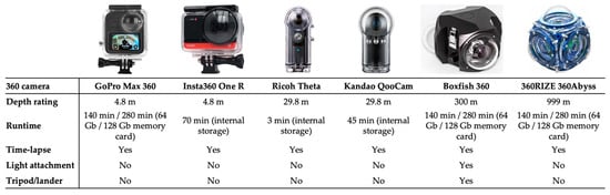 Because high-quality custom 360-degree camera setups could present a high cost, we focused here on COTS cameras. To select the right camera, we compared the following technical considerations of six COTS 360-degree cameras that could fit the purpose of this study (Figure 1): depth rating compatible with all known marine energy deployments to date, runtime of several hours, the possibility for time-lapse frame capture, possibility to attach external lights, and possibility to mount on a tripod or custom-made frame for deployment as a video lander on the seafloor. Depth ratings range from 4.8 m (without dedicated underwater housing) to 999 m (with pressure-proof housing); the runtime varies from 3 min to 70 min using internal storage and to 140 min or 280 min using memory cards (with 64 Gb and 128 Gb capacities, respectively). All these 360-degree cameras offer time-lapse options and various possible settings. The size and shape of the cameras’ housing matter when it comes to attaching external lights and mounting the camera on a tripod or custom-made frame. Smaller builds such as the GoPro Max 360, Insta360 One R, Kandao QooCam, or Ricoh Theta cannot handle many external accessories and are better hand-held or mounted on a monopod. The 360RIZE 360Abyss is a cube housing with a GoPro and lens dome on each of the six faces, which makes it challenging to attach lights and mount them on a frame. In addition, a previous study reported that the GoPro Max 360 tends to overheat after an hour, both on land and underwater, and the Insta360 One R tends to move in the housing if not safely secured [19]. Overall, the Boxfish 360 camera met all our criteria (Figure 1). In addition, it comprises a sensor package that records environmental data (depth, water temperature, and camera orientation) every second.