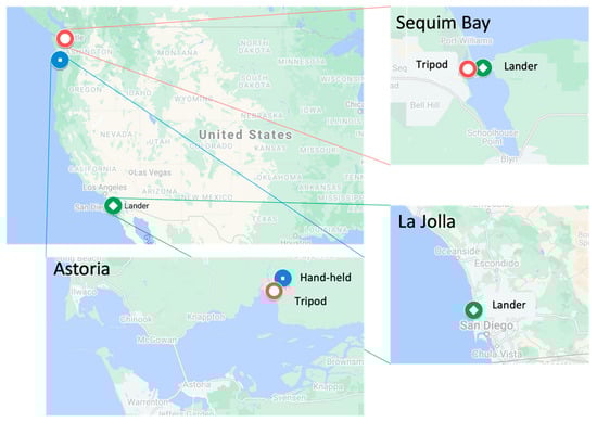 U.S. west coast deployment locations of the Boxfish camera in the hand-held, tripod, and lander configurations.