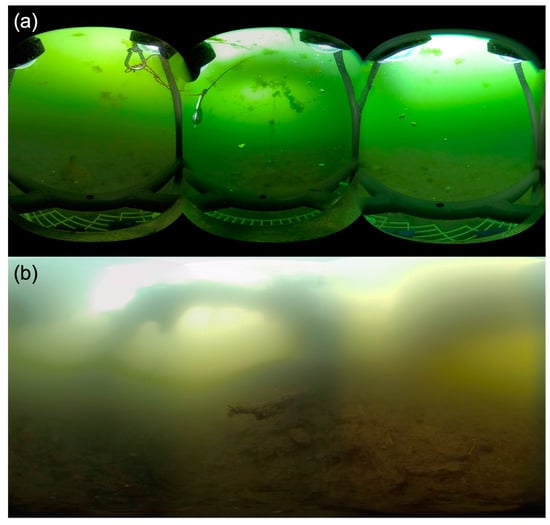 A challenge of many drop cameras and video landers for surveying the AR and FAD effects of artificial structures such as marine energy devices is the total field of view. Often, the frame only bears one camera facing one direction (e.g., [16]), or two video cameras facing opposite directions, and all or parts of the targeted structure will be missed if not in the field of view [8,10,17]. One way to alleviate this issue would be to use 360-degree underwater video footage, which would then cover all directions. One could use three individual video cameras, mounted at 120° from each other on a frame for deployment as a drop camera or video lander (e.g., [10,18]), or use actual commercial off-the-shelf (COTS) 360-degree video cameras (e.g., [15,19]). Recording underwater footage over a 360-degree field of view for surveying AR and FAD effects assures that the targeted structure will be visible, assuming that water visibility and the distance from the target are considered. In addition, while using three individual video cameras may be cheaper than a proper 360-degree video camera because of the relative novelty of the latter, processing and analyzing the video footage from three non-stitched individual sources is much more time-consuming and challenging than from a single source.