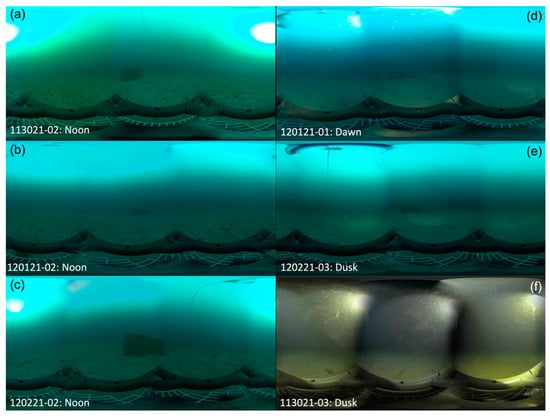 Selection of screenshots from the deployments in La Jolla, CA, showing the distance of the anchor from the lander and the variability in target visibility between deployments: (a–c) three noon deployments without external lights; (d) late dawn deployment with external lights; (e) early dusk deployment with external lights; and (f) late dusk deployment with external lights. The stitch marks between the three videos, delimiting the viewing frames, are visible as vertical lines on the images, and the anchor is centered in the background.