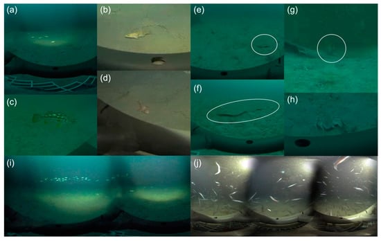 Screenshots of fish and mega-invertebrates observed on the video footage from La Jolla, CA: (a,b) sand bass; (c) kelp bass; (d) California scorpionfish; (e,f) flatfish, circled in white; (g) Unidentified invertebrate, circled in white; (h) octopus; and (i,j) bait fish schools.
