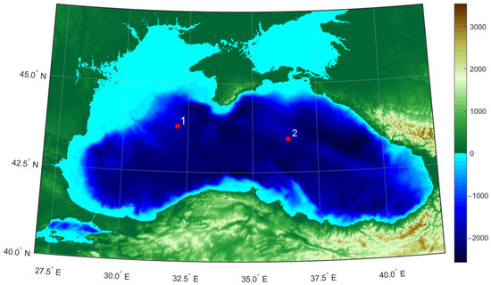 The anchored buoy stations (ABS) locations in 2016–2018. Bathymetry of the Black Sea according to ETOPO1 data doi:10.7289/V5C8276M. 1—is for ABS No. 1, 2—is for ABS No. 2.