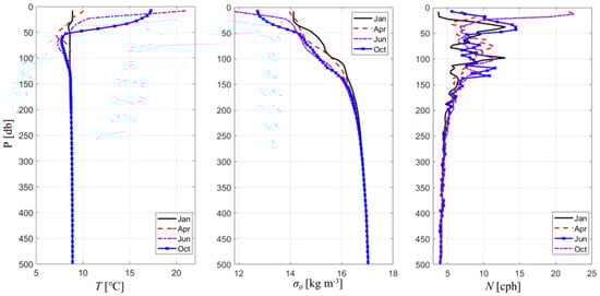 The vertical stratification was obtained from the Argo float data available in the observation region for 2017 (Figure 2). In the warm season, the vertical stratification was characterized by seasonal and main pycnoclines. The upper quasi-homogeneous layer began to form in April due to the warming of surface waters and could be observed until October. The seasonal pycnocline was sharpest in June at depths of 30–40 m. In autumn, the position of its lower boundary gradually shifted to a depth of 50 m. Two maxima characterized the buoyancy frequency profile: subsurface = 23 cph and deep maximum > 10 cph in the main pycnocline that was located usually below 80 m.