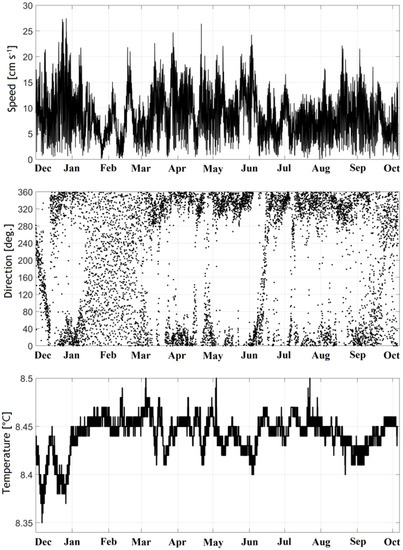 Time series of current speed (top) and direction (middle) and temperature (bottom) at the 100 m depth at ABS No. 1 from 1 December 2016 to 5 October 2017. The graphs are based on data averaged over 1 h.