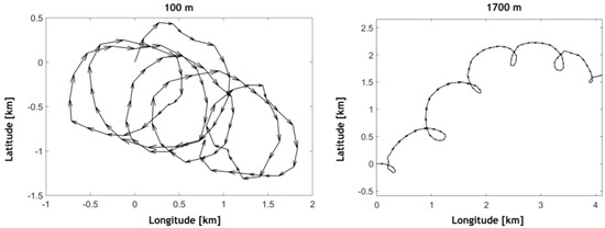Progressive vector diagram of the currents at 100 m and 1700 m depths of ABS No. 1 from 00:00 20 January 2017 to 03:00 24 January 2017. The data were averaged over 1 h. The horizontal and vertical axes show the distances in longitude and latitude from the starting points of the data ensembles.