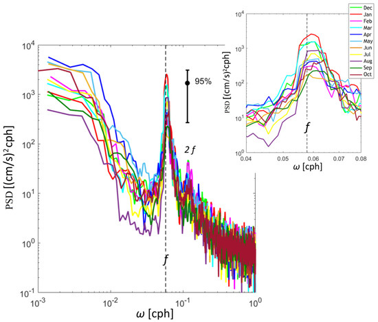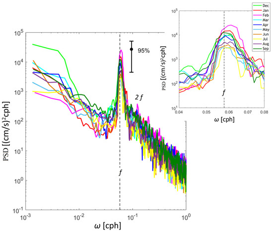 The rotary spectra of clockwise rotation motion at 100 m at ABS No. 1 in different months. The dashed line indicates the local inertial frequency in the study area. The small image in the upper right corner is an enlargement of the figure to better visualize the peaks close to the inertial periods.