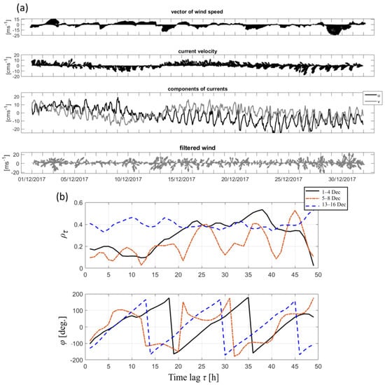 (a) Top—wind speed vector plot from the ERA-5 meteorological reanalysis data. The second plot from the top is the current velocity at 100 m at ABS No. 1 in December 2016, and the third plot from the top shows the - and -components of the current velocity. Bottom—wind speed after band-pass filtering for 22–26 h. (b) Top—lagged correlations between the wind and current vectors for 1–4, 5–8, and 13–16 December 2016, bottom—the angle of rotation of the current velocity vector relative to the wind velocity vector.