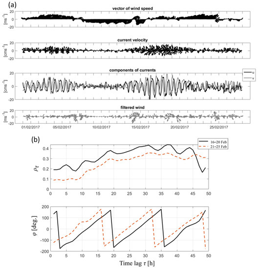 (a) Top—wind speed vector plot from the ERA-5 meteorological reanalysis data. The second plot from the top is the current velocity at 100 m at ABS No. 1 in February 2017, and the third plot from the top shows the - and -components of the current velocity. Bottom—wind speed after band-pass filtering for 22–26 h. (b) Top—lagged correlations between the wind and current vectors for 16–20 and 21–25 February 2017, bottom—the angle of rotation of the current velocity vector relative to the wind velocity vector.