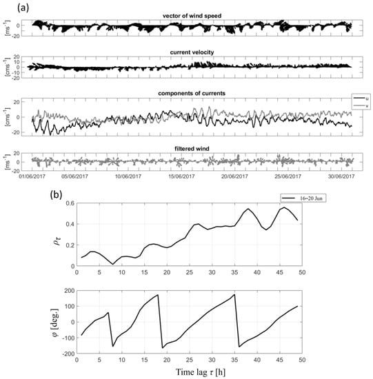 (a) Top—wind speed vector plot from the ERA-5 meteorological reanalysis data. The second plot from the top is the current velocity at 100 m at ABS No. 1 in June 2017, and the third plot from the top shows the - and -components of the current velocity. Bottom—wind speed after band-pass filtering for 22–26 h. (b) Top—lagged correlations between the wind and current vectors for 16–20 June 2017, bottom—the angle of rotation of the current velocity vector relative to the wind velocity vector.