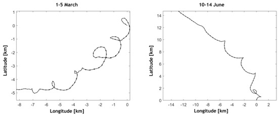 Progressive vector diagrams of currents at 100 m depth for selected periods in March (left) and June (right) of 2017.