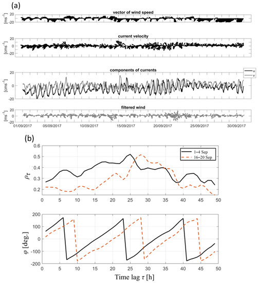 (a) Top—wind speed vector plot from the ERA-5 meteorological reanalysis data. The second plot from the top is the current velocity at 100 m at ABS No. 1 in September 2017, and the third plot from the top shows the - and -components of the current velocity. Bottom—wind speed after band-pass filtering for 22–26 h. (b) Top—lagged correlations between the wind and current vectors for 1–4 and 16–20 September 2017, bottom—the angle of rotation of the current velocity vector relative to the wind velocity vector.