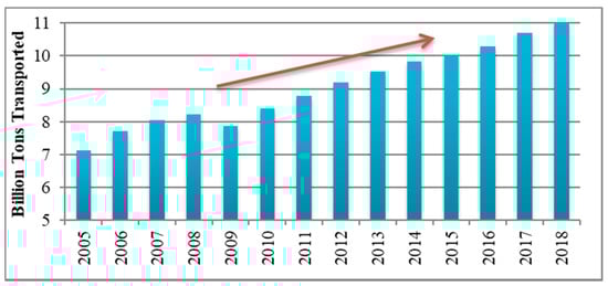 Maritime transport outperforms other transportation modes in terms of the amount of transported cargoes measured in ton-kilometers. The proportion of cargo moved by sea varies from year to year, but in the recent years, waterborne trade in the United States (USA) has represented between 22 and 24 percent of the total ton-kilometer cargo movements, which is more than $1.5 trillion worth of goods []. Overall, this results in a yearly economic output of $5.4 trillion. The maritime transportation system plays an important role in Europe as well. According to the European Commission, waterborne trade between nations (also known as short-sea shipping) accounts for nearly 41 percent of the freight transport market in Europe []. Due to the lower cost of maritime transport in comparison to other modes of shipping, such as air freight, international seaborne trade has increased by 67 percent in terms of weight between 1980 and 2007 []. Moreover, the international waterborne trade volumes have been constantly growing since 2009 and reached approximately 11.0 billion tons in 2018, which is more than a 40% increase compared to 2009 (see Figure 1). Nevertheless, in comparison to other modes of transportation, the sea freight industry is facing unprecedented and chaotic conditions, such as port congestion, labor strikes, severe weather conditions, shipping container shortages, and customs delays [,,,]. After the analysis of 5410 ship arrivals at ports, Drewry Shipping determined that approximately 21% of ships were one day behind the planned arrival, whereas 22% of ships were delayed by two or more days [].
