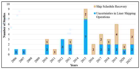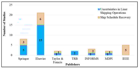 A thorough literature search is essential in order to perform a comprehensive survey study. As a part of this research effort, a detailed literature search was conducted by means of the content analysis method []. The following keywords and their combinations were used to guide the search process: “liner shipping”, “shipping lines”, “liner shipping companies”, “ship schedule design”, “vessel schedule design”, “ship timetable design”, “vessel timetable design”, “uncertainties”, “ship schedule recovery”, “vessel schedule recovery”, “recovery strategies”, and “recovery options”. The following search engines were used during the search process: Science Direct, IEEE Explore, Web of Science, Scopus, Springer Link, and Google Scholar. Hundreds of studies were identified after the initial search. Books, book chapters, journal papers, and conference papers written in English were considered. After a review of the collected studies, it was found that a total of 43 studies were closely related to the theme of the present literature survey, directly focusing on uncertainties in liner shipping operations and ship schedule recovery. Figure 2 depicts the distribution of selected studies by subject category and year of publication, whereas Figure 3 depicts the distribution of collected studies by publisher.