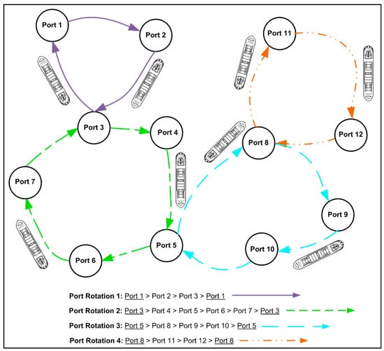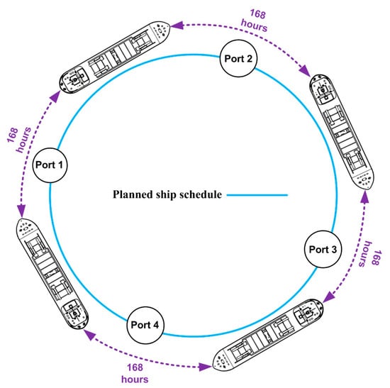 Chartering of ships from other shipping lines incurs an additional ship chartering cost (USD/day), which is typically higher than the cost associated with operating own ships (—USD/day). To prevent excessive ship chartering costs, the shipping line may decide to increase the ship sailing speed, which will reduce the total ship turnaround time and require fewer ships for deployment. An example of the shipping route service is presented in Figure 5, where a total of four ships are deployed to visit the ports of call. The ships provide weekly port service frequency (i.e., each port is visited every one week or 168 h; days).
