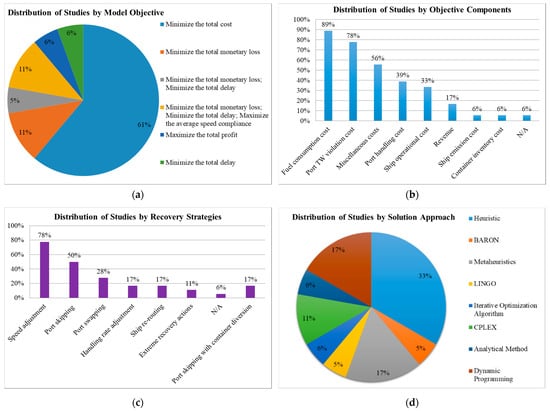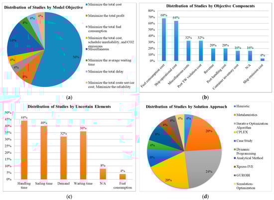 Distribution of the reviewed studies on uncertainties in liner shipping operations by various attributes: (a) model objective; (b) objective components; (c) uncertain elements; and (d) solution approach.