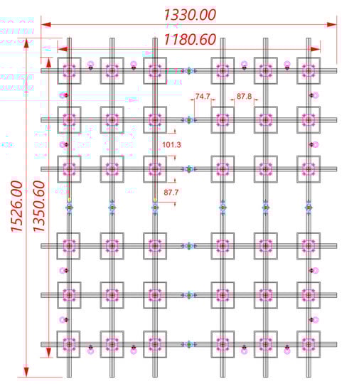 The unit consists of nine floating bodies. These were designed as cuboids for convenient production. To understand the relative behavior between units under wave conditions, two-row and two-column matrix forms were combined and called a block. Table 1 lists the specifications of the FSP components. In addition, a uniaxial hinge system with a length of 50 mm was constructed so that relative behavior between units could be investigated. The position of the connector was installed on the parallel line where the frame bars were located. Figure 2 shows the overall geometry of the model tested in this study.