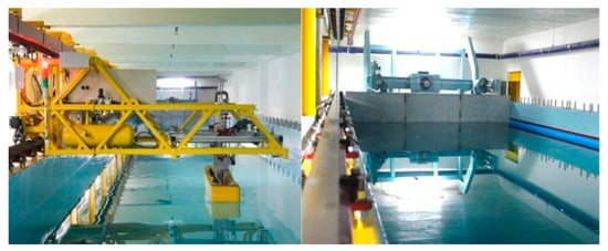 The experiment in this study was conducted in the IUTT (see Figure 3). The IUTT consists of a wave maker that can generate a maximum wavelength of 2.0 m and wave height of 0.2 m; a wave absorber; and a concrete tank that has a length, breadth, and depth of 50 m, 3.5 m, and 1.5 m, respectively. The breadth of the FSP at the waterline is about 1.1806 m (see Figure 2). The model size was selected to minimize the effect of blockage.