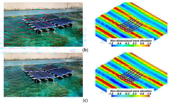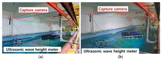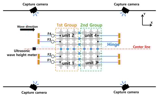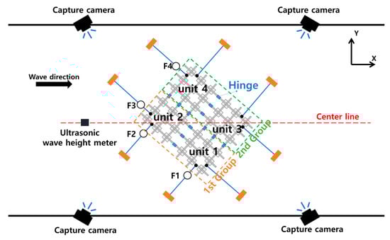 As shown in Table 2, the experimental conditions were selected within the range that can be experimented with using the IUTT. refers to the waterline length of a unit in the x-direction. Two incident wave angles (139°, 180°), two wave steepnesses ( = 0.03, 0.05), and wavelength ratios ( = 1.6–3.2) were considered in the experiment. Here, is the wavelength and is the wave height. Only regular waves were used.