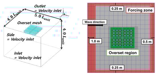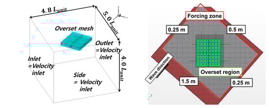 In a previous study, the effects of the wave (e.g., wave run-up, reflections, and diffractions) occurred owing to the blunt geometry and spacing of the floating bodies [16,17]. Due to the forcing boundary absorbed the effects of the wave, the domain size was set as shown in Figure 7 and Figure 8, respectively. The computation was an implicit unsteady condition, and the time step was set approximately /250 s. Here, is the wave period. Approximately 5 million and 6 million grids were used in the computations for the head sea and oblique sea conditions, respectively.