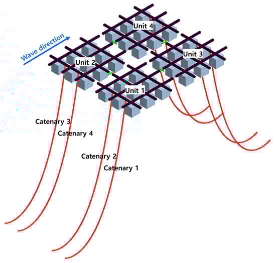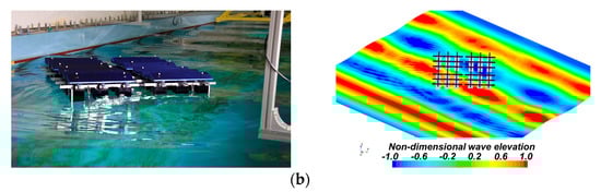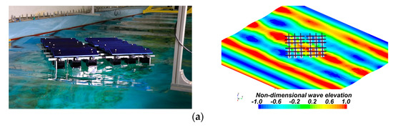 The overall forms in which the mooring lines and hinges were applied to the FSP are shown in Figure 9. The same geometry and physical property values of the model used in the experiment were applied in the computation simulations. The test conditions used to verify the numerical method are listed in Table 3.