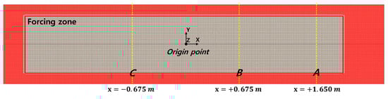 This section presents the results of an examination of the computational conditions to accurately simulate waves under the conditions given in the experiment. Considered as a 2D problem, the target waves are two types of stokes waves ( = 1.35 m, = 0.0405 m; and = 1.80 m, = 0.054 m). The total simulation time corresponded to eight cycles of the wave. The data were extracted at three points (x = +1.650 m, +0.675 m, and −0.675 m from the origin) to verify the correctness of the implementation for the target wave (see Figure 10).