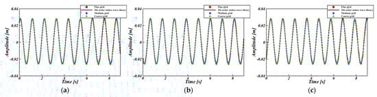 The wave profiles of the numerical and theoretical solutions obtained at each point by the grid systems were compared as shown in Figure 11 and Figure 12, where the black solid line is the theoretical solution. The coarse, medium, and fine grids are the green-triangle, blue-square, and red-circle symbols, respectively.