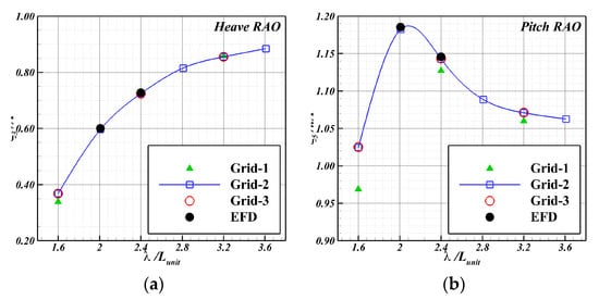 In this section, the grid convergence tests for the FSP computation are presented. The test subject was set to one unit, and the free surface was set to three stages, as described in Section 4.1. The grid convergence index (GCI) [21,22,23] of the test conditions are listed in Table 5. The GCI in this study represents the difference in the result value due to the grid variation represented by Grid-1, Grid-2, and Grid-3. The grid numbers of Grid-1, Grid-2, and Grid-3 were 0.96 million, 1.36 million, and 1.92 million, respectively. The number of grids was changed by changing the basic grid. In the grid convergence test, the difference of motion RAOs was reduced with the increase of grid size. The heave RAO GCI is 0.00048, 0.00031, and 0.00055 at wavelength ratios of 1.6, 2.4, and 3.2, and the pitch RAO GCI is 0.00057, 0.00183, and 0.00180 at the same wavelength ratios.