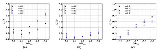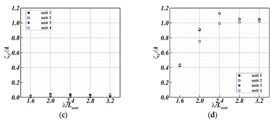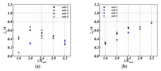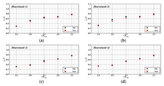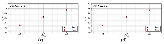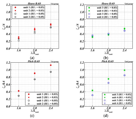 The experimental results of the motion RAOs of each unit of the FSP under waves at = 0.03 according to the wavelength are shown in Figure 14. Here, the circular and square symbols represent an odd-numbered and even-numbered unit, respectively. Black and blue denote the first and second groups, respectively.