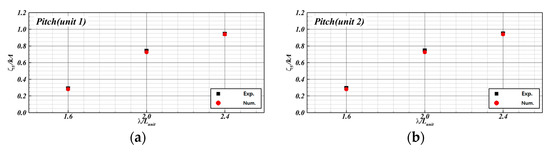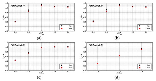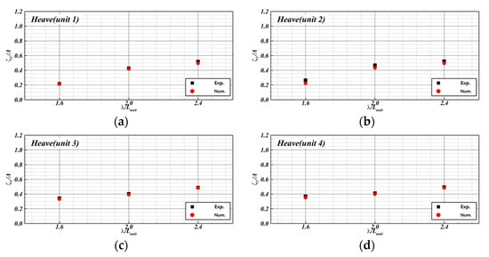 The computation results of motion RAOs according to wavelength were compared with the experimental results (see Figure 16 and Figure 17). Here, the black-square and red-circular symbols represent the experimental and computation results, respectively. The heave RAOs are shown in Figure 16. Similar results were observed overall. The heave RAOs increased linearly with the wavelength. The pitch RAOs are shown in Figure 17. The computation results matched a maximum value at = 2.4, which is the same as the experiment, which was influenced by the wave conditions. However, the heave and pitch RAOs showed a difference from motion RAOs.
