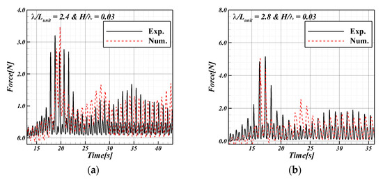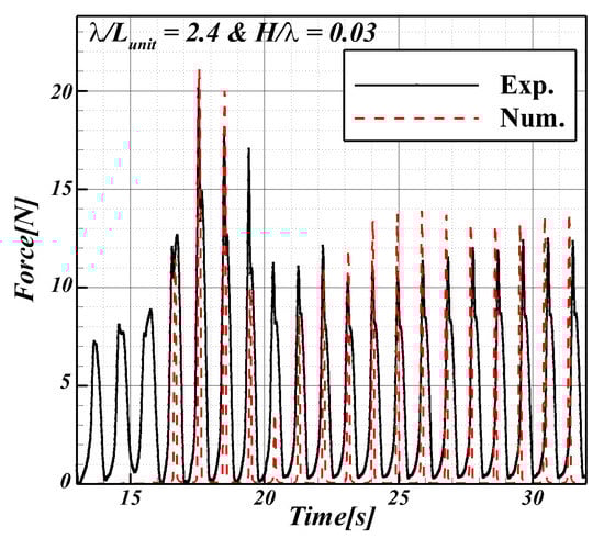 At = 0.03, = 2.4, the time series data of the total tension was measured on the mooring lines connected to the FSP (see Figure 18). Here, the black-solid and red-dotted lines represent the experimental and computation results, respectively. The tension time series shows two points. One is the maximum load point where the FSP was farthest from the initial position. The second point is the average load point where the position of the FSP converged owing to the restoration of the mooring lines. Compared to the experiment, it showed a similar trend that the period in which the load was generated and the two tension change points. The total tension of the mooring lines is expressed as the maximum and average loads (see Table 6). The maximum tension was observed at = 2.0, where the difference of surge RAO between the units was large. We observed a tendency to converge even at tensions with 2.4.