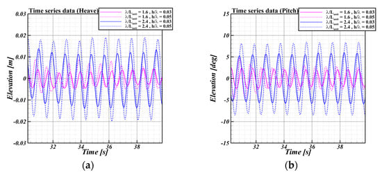 The time series motion data for the heave and pitch of Unit 1 in the experiment according to the wave steepness for = 1.6 and 2.4 are shown in Figure 19. Here, the pink and blue colors represent = 1.6 and 2.4, respectively. The solid and dotted lines represent = 0.03 and 0.05, respectively. When the wave steepness is constant, the variation at = 2.4 is larger than that for 1.6, because the height of the wave varies significantly.