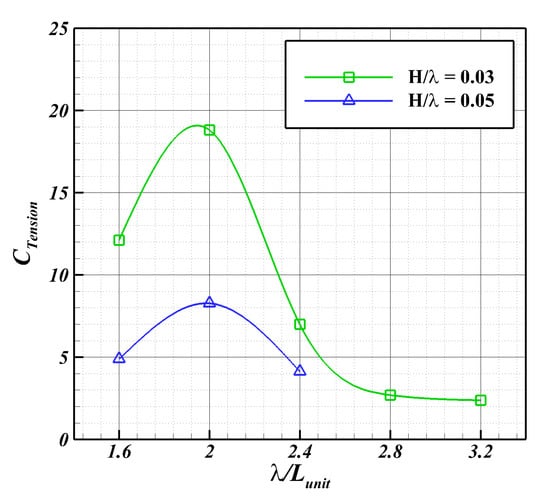 The tension was larger at = 2.0, and the maximum load occurred at a wavelength ratio equal to that mentioned in Section 5.2. In addition, as the wave height increased, the wave energy increased with the load. It is expressed non-dimensionally to analyze the tension by excluding the wave conditions (see Figure 24). The tension coefficient () is identical to that in Equation (5):