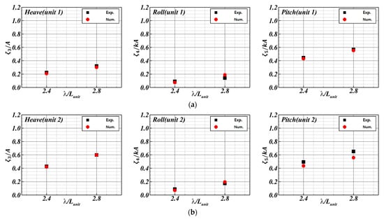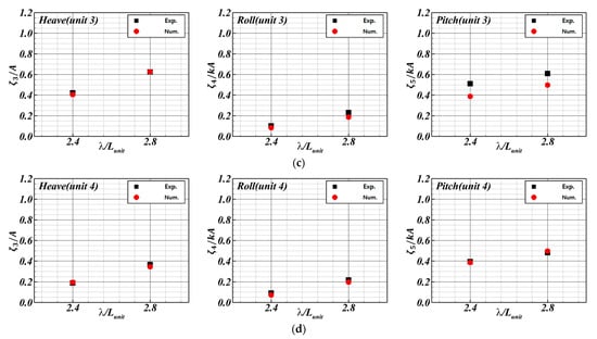 In this study, we conducted a model test under oblique wave conditions by rotating the FSP, which leads the waves to enter diagonally. Units 2 and 4 of the FSP were arranged in a straight line, and the FSP was rotated by 41°. The experimental results of the motion RAOs of each unit of the FSP under oblique waves are shown in Figure 25.