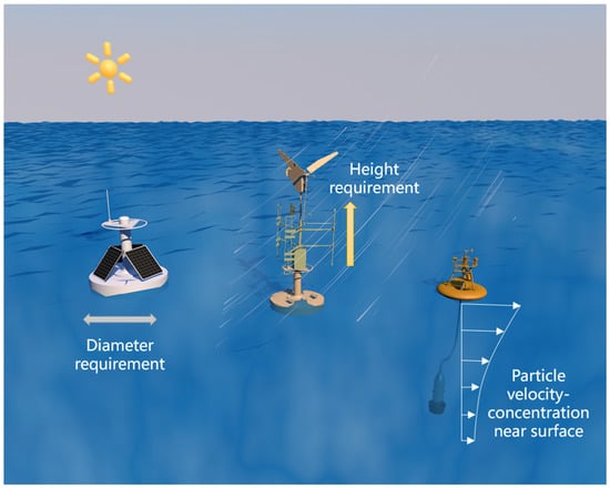 In terms of engineering, the wind turbines’ requirement for clearance height is quite incompatible with marine buoys. The clearance height means that the buoy needs to include an additional structure with a considerable (relative to the height of the buoys) freeboard [,]. This would significantly increase the capsizing vulnerability, as well as the structural materials, and harm the concealment of marine buoys. Similarly, solar panels’ requirement for surface area forms a challenge for marine buoys []. Considering the relatively lower power density of the solar energy, it would create a contradiction between the buoy’s horizontal dimension and its load capacity. In addition, solar panels need to stay away from run-up waves, making a solar power system less stable in marine environments [,]. Figure 1 is a concise diagram showing the primary engineering challenges corresponding to various power systems on buoys.