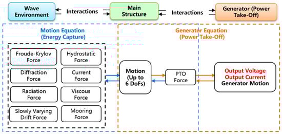 The wave energy utilization can be decomposed into two critical processes: (wave) energy capture and PTO. Figure 2 depicts the generic working mechanism of a wave energy marine buoy. Energy capture is upstream of wave energy utilization, which refers to the critical process of harvesting the wave (fluid) energy with the main structures (solid) and achieving the mechanical energy for PTO. Therefore, energy capture is governed by the fluid–structure interactions (i.e., hydrodynamics), which are subject to the inputs (e.g., wave height, period, water depth, etc.) and the main structure design (such as floating structure dimension, geometry, mass, moment of inertia, center of gravity, mooring configuration and stiffness, etc.). Though they have not converged, mainstream designs of energy capture include three categories: oscillating water columns (OWC), oscillating bodies (OB) and overtopping devices [].