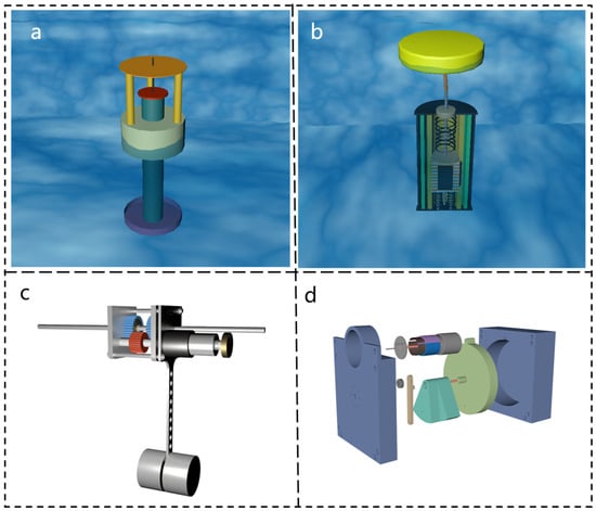 Electromagnetic generator (EMG)-based power take-off (PTO); (a) mechanical transmission PTO [], reproduced with permission from the authors; (b) permanent-magnet PTO [], reproduced with permission from the authors; (c) hydraulic flywheel PTO [], reproduced with permission from CC BY 4.0; (d) pendulum-based PTO [], reproduced with permission from CC BY 4.0.