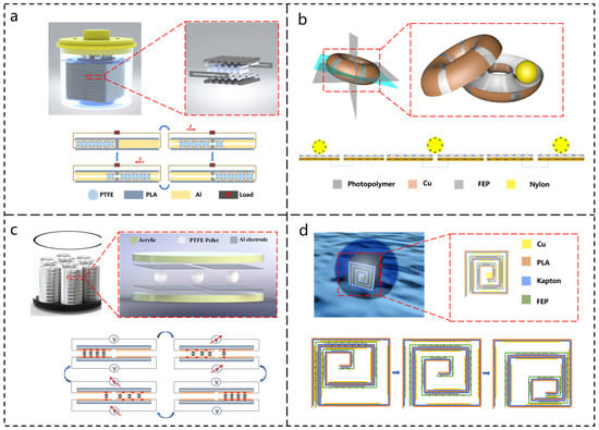 Triboelectric nanogenerator (TENG)-based PTO: (a) stackable fixed track TENG [], reproduced with permission from MPDI; (b) torus track TENG [], reproduced with permission from Elsevier; (c) stackable flexible track TENG [], reproduced with permission from Elsevier; (d) whirling-folded TENG [], reproduced with permission from the author.