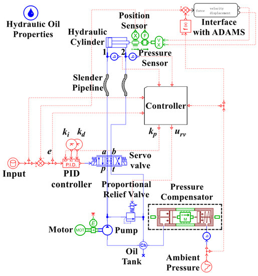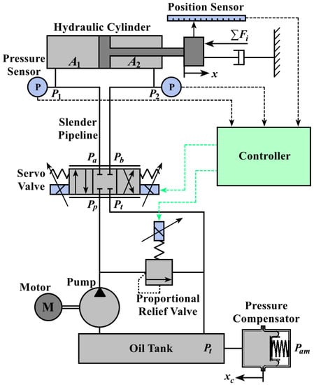 The schematic diagram of a deep-sea VCHCS is shown in Figure 1. The system consists of an oil tank, a pressure compensator, a pump source, a proportional relief valve, a servo valve, two slender pipelines, two pressure sensors, a hydraulic cylinder, a position sensor, and a controller. The fundamental equations of the core components are described below, which contribute to the basis of the system modeling and the energy-saving control strategy. Nomenclature in this paper can refer to Appendix A.